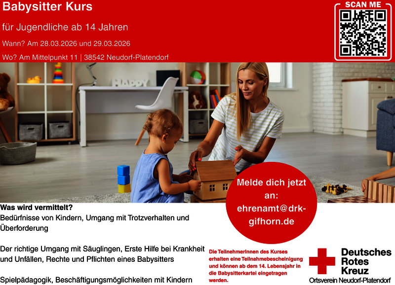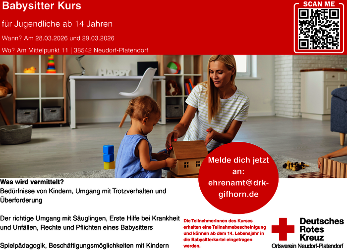 Babysitter-Kurs für Jugendliche ab 14 Jahren beim DRK Ortsverein Neudorf Platendorf